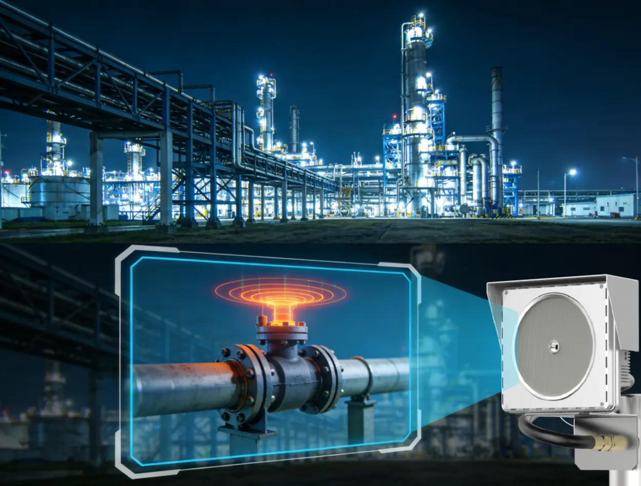 The Acoustic Imaging Leak Detection System is developed by CRYSOUND and has already been deployed in multiple coal chemical, petrochemical and natural gas facilities. It is used for online leak monitoring in high‑risk areas. This article is written by the Acoustic Imaging Leak Detection System project team at CRYSOUND based on real‑world deployment and operation experience. In a straightforward way, we will explain why such a system is needed, how it works in principle, what actually changes after it is put into service on site, and what it can and cannot do. Why is traditional leak inspection so difficult? In petrochemical plants, natural gas stations, coal chemical complexes and hazardous chemical storage yards, everyone understands how sensitive the word “leak” is. What really makes life hard is that many critical points are located high above ground, on pipe racks or at the tops of towers. In the past, finding a small leak at height usually meant going through a process like this: • Erect scaffolding or use a man‑lift and spend hours going up and down; • Climb around the pipe racks with soap solution or portable instruments in hand; • In winter, hands are frozen stiff; in summer, clothes are soaked with sweat, and even after checking a full round, people still worry: “There are so many valves and flanges, did we miss something?” To sum up, traditional leak inspection at such sites has several persistent pain points: • High locations: pipe racks at 20 meters or tower tops are hard to reach. Temporary access equipment is costly and high‑risk to use. • Very quiet leaks: the ultrasonic signals generated by small leaks are drowned in the noise of pumps and fans, and are practically impossible to hear with the human ear. • Invisible leaks: in the early stage, leak flow is tiny. Soap solution doesn’t bubble, and the smell is faint. By the time you actually see stains or smell gas, the leak has usually spread. • Low efficiency: a single process area can easily have thousands of monitoring points. Manual “up and down” inspection is mostly spot‑checking, and it is very hard to achieve truly continuous and full coverage. Traditional electrochemical, infrared and laser‑based detection methods are essentially point or line monitoring: • Measuring at a fixed point to see whether the concentration exceeds a threshold; • Watching along a single optical path to see whether any gas crosses it. What operators actually want, however, is not only to know whether a leak exists, but also to see clearly, over a wide area, exactly where the leak is occurring. That is precisely the problem that the ultrasonic acoustic imaging leak detection system (Acoustic Imaging Leak Detection System) is designed to solve. Acoustic Imaging Leak Detection System: Turning “inaudible leak noise” into colorful soundmap on the screen Basic principle: pressurized gas leak → ultrasonic signal → colorful soundmap on the image When pressurized gas escapes through valve gaps, tiny flange cracks or weld defects, it interacts with the surrounding air and produces intense turbulence, creating a class of ultrasonic signals with distinct characteristics: • The greater the leak rate, the stronger the ultrasonic signal; • The higher the pressure difference, the more pronounced the acoustic characteristics; • These signals are quite different from the lower‑frequency mechanical noise of motors and pumps, which makes it possible to pick them out from the background. What Acoustic Imaging Leak Detection System does is to convert this “inaudible sound” into “visible images” in a smart way: • A multi‑channel ultrasonic sensor array is used to acquire ultrasonic signals simultaneously from multiple directions; • At the front end, amplification, filtering and denoising are performed to remove electromagnetic interference and low‑frequency background noise as much as possible; • Phase and amplitude differences between channels are analyzed to estimate the spatial distribution of sound energy and to infer from which direction and which area the leak noise is coming; • The sound energy distribution is mapped into a two‑dimensional “heat map” and overlaid onto the live video image from the field. In the end, the location with the strongest leak signal will appear as a red‑yellow‑green “cloud” on the display. For operators, the effect is very intuitive: wherever a cloud appears on the image, that is where something looks suspicious.  Engineering parameters: how far and how small can it detect? Based on field tests and joint calibration results from multiple online projects,Acoustic Imaging Leak Detection System exhibits the following typical capabilities in engineering applications: Recommended detection distance: 0.5–50 m. Within roughly 1–30 m, the system achieves better signal‑to‑noise ratio and imaging performance for small leaks. Operating frequency range: Acoustic Imaging Leak Detection System operates in the ultrasonic band (above 20 kHz). A band‑pass filter is used to select the leakage characteristic band (typically 20–40 kHz), effectively suppressing audible‑range and low‑frequency mechanical noise. Minimum detectable leak rate / orifice size (for typical conditions): Under a minimum pressure difference of about 0.6 MPa, Acoustic Imaging Leak Detection System can provide visual detection for early‑stage leaks around the 0.1 mm scale at valve gaps and flange micro‑cracks. The actual sensitivity varies with gas type, pressure, background noise and sensor placement. Localization accuracy: Within the recommended detection distance, Acoustic Imaging Leak Detection System can provide leak localization with approximately centimeter‑level accuracy. Combined with the video image, it can effectively point to a specific piece of equipment or flange area on the screen. These values are not rigid, unchanging limits, but rather typical engi