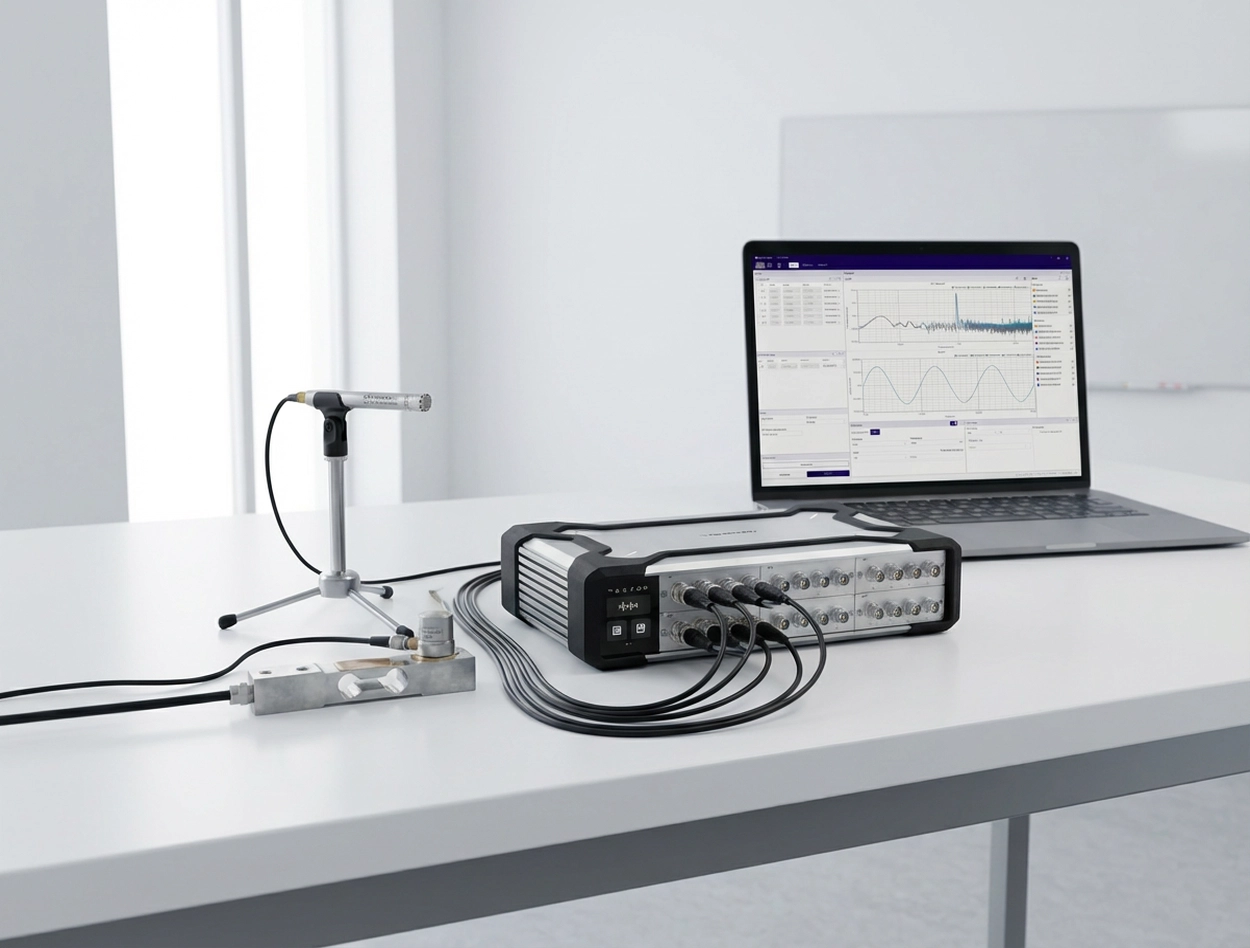 A data acquisition system (DAQ) is the measurement front end: it converts analog sensor outputs—such as voltage, current, and charge—into digital data. The signal is first conditioned (amplification, filtering, isolation, IEPE excitation, etc.) and then fed to an ADC, where it is digitized at the specified sampling rate and resolution; software subsequently handles visualization, storage, and analysis. This article systematically reviews common DAQ form factors, including PCIe/PXI plug-in cards, external USB/Ethernet/Thunderbolt devices, integrated data recorders, and modular distributed systems. It also summarizes key selection criteria—signal compatibility, channel headroom and scalability, sampling rate and anti-aliasing filtering, dynamic range, THD+N, clock synchronization and inter-channel delay, as well as delivery and after-sales support—to help readers quickly build a clear understanding of DAQ systems. Why Data Acquisition Matters? In the real world, physical stimuli such as temperature, sound, and vibration are everywhere. We can sense them directly; in a sense, the human body itself is a “data acquisition system”: our senses act like sensors that capture signals, the nervous system handles transmission and encoding, the brain fuses and analyzes the information to make decisions, and muscles execute actions—forming a closed feedback loop. Progress in science and engineering ultimately comes from observing, understanding, and validating the world with more reliable methods. Physical quantities such as temperature, sound pressure, vibration, stress, and voltage are the primary carriers of information. However, human perception is subjective and cannot quantify these changes accurately and repeatably; and in high-current, high-temperature, high-stress, or high-SPL environments, direct exposure can even cause irreversible harm. To enable measurement that is quantifiable, recordable, and safer, data acquisition systems (DAQ) came into being. Put simply, a data acquisition system (DAQ) is an analog front end that converts a sensor’s analog output (voltage/current/charge, etc.) into digital data at a defined sampling rate and resolution, and hands it to software for display, logging, and analysis (typically with the required signal conditioning). It helps engineers see problems more clearly—and solve them. In today’s development cycles—from cars and aircraft to consumer electronics—it’s difficult to validate performance, safety, and reliability efficiently without data acquisition. In durability testing, DAQ records cyclic load and strain for fatigue-life analysis; in noise control, synchronous multi-point acquisition of vibration and sound pressure helps identify noise sources and transmission paths. This quantitative capability is what provides a scientific basis for engineering improvements. DAQ applications span a wide range of fields: Automotive NVH and mechanical vibration testing: Used to acquire body vibration, noise, engine balance, structural modal data, and more—helping engineers improve vehicle ride comfort. Audio testing: In the development and production of speakers, microphones, headphones, and other audio devices, DAQ is used to measure frequency response, SPL, distortion, and more, to verify acoustic performance. Industrial automation and monitoring: DAQ is widely used for process monitoring, condition monitoring, and industrial control. For example, it acquires temperature, pressure, flow, and torque sensor signals to enable real-time monitoring and alarms, and it often must run continuously with high stability and strong immunity to interference. Research labs and education: From physics and biology experiments to seismic monitoring and weather observation, DAQ is a basic tool for capturing raw data. It makes data recording automated and digital, which simplifies downstream processing. As quality and performance requirements continue to rise across industries, DAQ has become an indispensable set of “eyes and ears,” giving engineers the ability to observe and interpret complex phenomena. Common DAQ Form Factors Depending on interface, level of integration, and the application, DAQ hardware comes in several common forms. Below are a few typical DAQ card/system categories: TypeForm factor / InterfaceAdvantagesLimitationsTypical ApplicationPlug-in DAQ cardPCIe / PXI / PXIeLow latency; high throughput; strong real-time performanceNot portable; requires chassis/industrial PC; expansion limited by platformFixed labs; rack systems; high-throughput acquisitionExternal DAQ deviceUSB / Ethernet / ThunderboltPortable; fast setup; laptop-friendlyBandwidth/latency depends on interface; driver stability is critical; mind power and cablingField testing; mobile measurements; general-purpose DAQIntegrated data recorderBuilt-in battery/storage/display (standalone)Ready out of the box; easy in the field; straightforward offline loggingChannel count/algorithms often limited; weaker expandability; post-processing depends on exportPatrol inspection; quick diagnostics; long-duration offline loggingModular distributed systemMainframe + modules; network expansion (synchronized)Mix signal types as needed; easy channel scaling; strong synchronizationPlanning matters: sync/clock/cabling; system design becomes more important at scaleSynchronized Multi-Physics Measurement;High-Channel-Count Scalability;Distributed, Multi-Site Testing Plug-in DAQ cards (internal): These are boards installed inside a computer, with typical interfaces such as PCI, PCIe, and PXI (CompactPCI). They plug directly into the PC/chassis bus and are powered and controlled by the host, providing high bandwidth and strong real-time performance for high-throughput applications in desktop or industrial PC environments. The trade-off is portability—these are usually used in fixed labs or rack systems. External DAQ devices (modules): DAQ hardware that connects to a computer via USB, Ethernet, Th