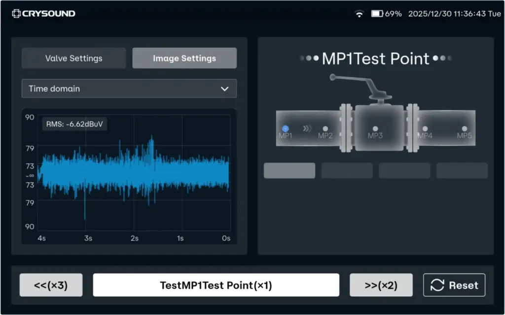 In the CRY8124 valve leak application, the software features a standardized and visualized workflow. Operators follow on-screen prompts to place the contact ultrasound sensor on each measurement point in sequence and simply tap “Test”. The results are displayed on the interface, and the algorithm automatically determines whether internal leakage is present after the test.