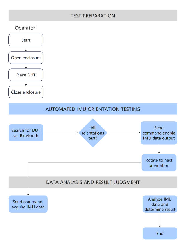 During a typical test, the host software establishes a connection with the device under test via Bluetooth or a wired interface, then sends commands to enable IMU data output. The rotary table sequentially moves to predefined orientations, while IMU data is collected and compared against reference angles. The entire process is automated, requiring the operator only to place the device and start the test, minimizing training effort and human error.