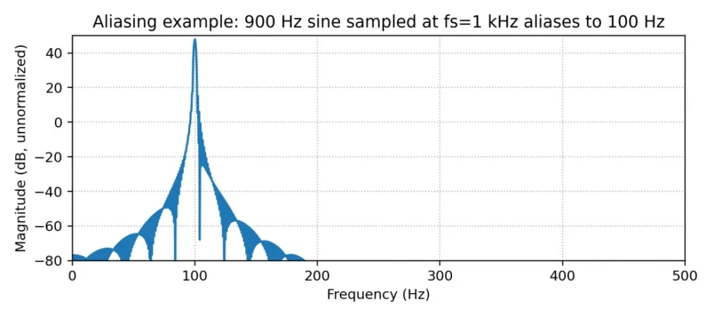 Exemple : une sinusoïde de 900 Hz échantillonnée à fs=1 kHz apparaîtra à 100 Hz dans le spectre discret – un artefact classique d'aliasing.