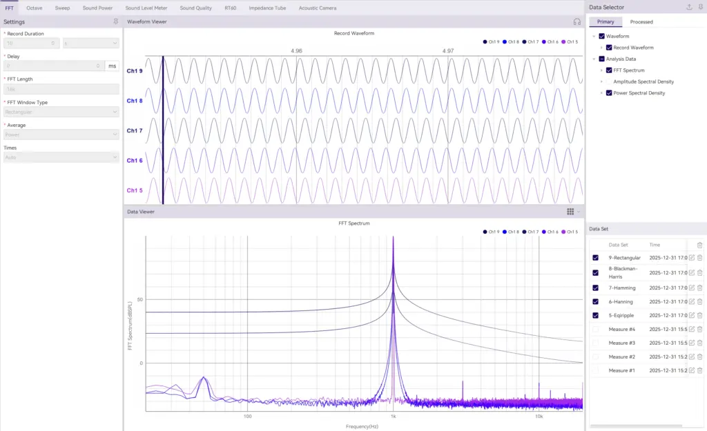 Dans OpenTest, vous pouvez basculer entre différentes fonctions de fenêtre dans le module d'analyse FFT et voir immédiatement l'impact sur la largeur des pics, les lobes secondaires et le bruit de fond.