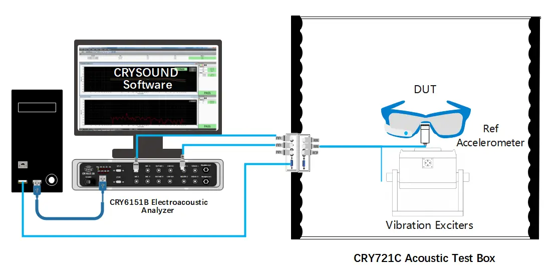 La solution de test VPU pour lunettes AR de CRYSOUND en ligne de production utilise l'analyseur électro‑acoustique CRY6151B comme plateforme de test et d'analyse. La table vibrante fournit une excitation stable, et le VPU du produit synchronise les signaux de réponse vibratoire avec un accéléromètre de référence. L'analyse logicielle évalue des paramètres clés tels que la réponse en fréquence (FR) et la distorsion harmonique totale (THD). Cette architecture de test équilibre l'efficacité des mesures et le débit de la ligne de production, répondant aux besoins de déploiement des tests VPU sur différents postes.