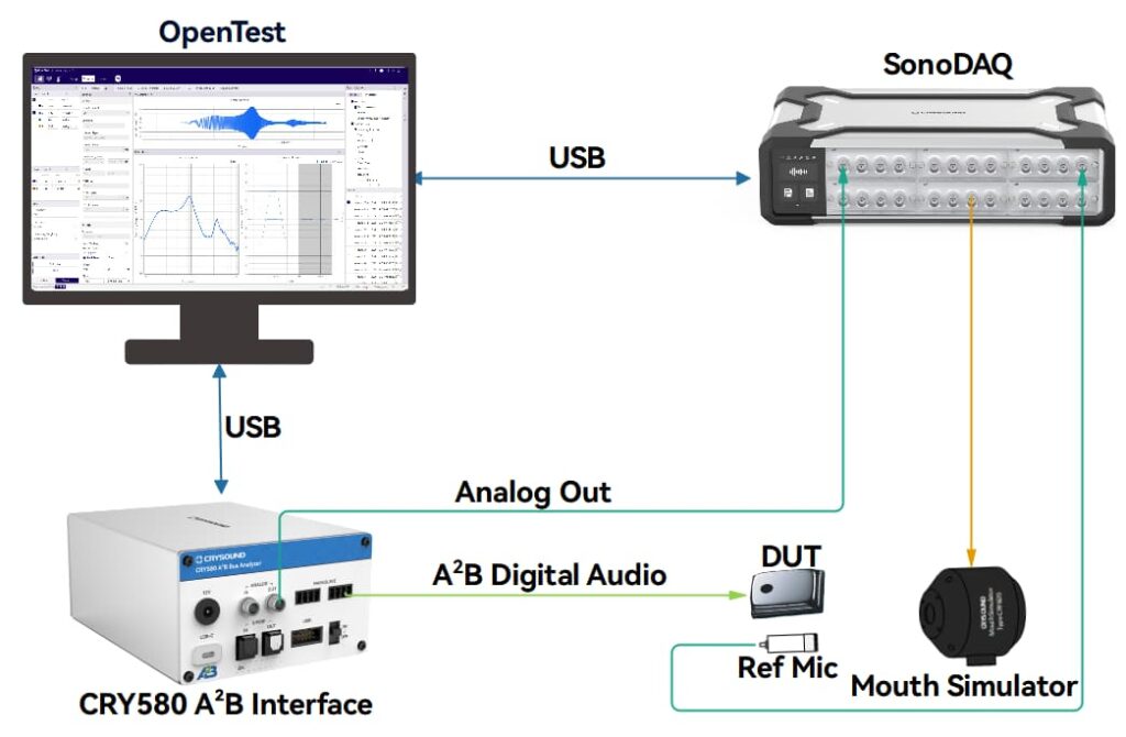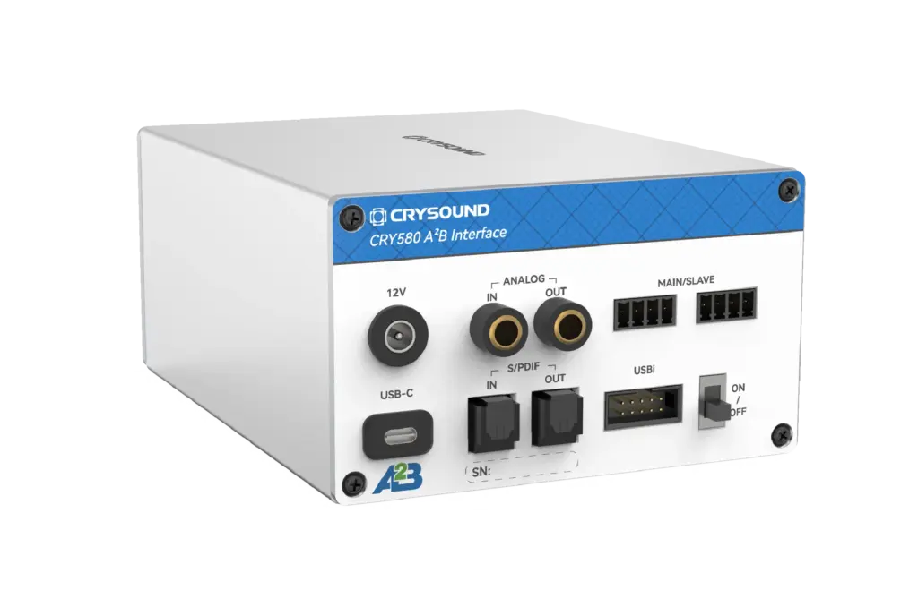 L'interface A²B CRY580 est un pont bidirectionnel conçu pour connecter l'écosystème A²B (Automotive Audio Bus) aux configurations de test et de mesure standard (par ex. SonoDAQ, CRY6151B, Audio Precision). Cet article explique ce qui rend les tests A²B difficiles — la plupart des analyseurs ne disposent pas d'une interface A²B native — et comment le CRY580 y répond en encodant/décodant les flux A²B et en les convertissant en sorties analogiques ou S/PDIF mesurables, tout en prenant en charge des chemins audio multicanaux I²S/TDM pour une validation rapide et répétable.