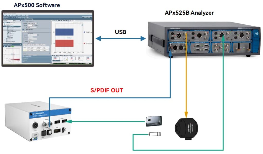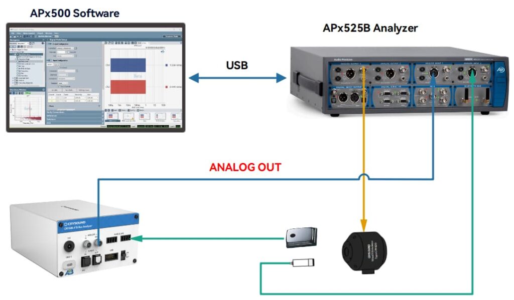 Dans la pratique, le « pontage » consiste à convertir les signaux audio A²B en formats analogiques ou numériques standard pour les tests : pour les tests d'amplificateurs A²B, injecter un stimulus analogique/numérique dans le bus A²B ; et pour les tests de capteurs A²B, extraire les données audio A²B en analogique ou S/PDIF pour la mesure. Le CRY580 sert de pont de test bidirectionnel idéal, facilitant une conversion et une mesure transparentes dans les deux sens.