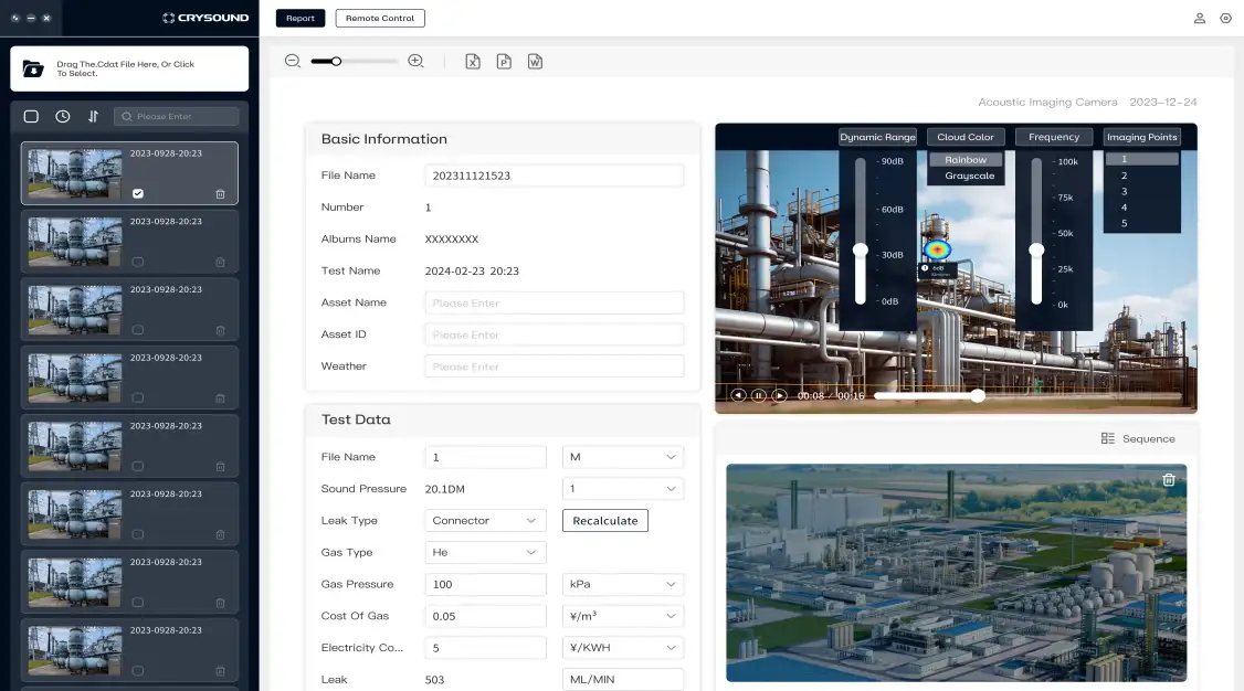 The acoustic camera uses advanced algorithms to quantify leaks by analyzing factors such as sound pressure levels, distance, leak type, and other characteristics of escaping gases. By accounting for variables like gas type, market value, and energy costs, the camera calculates the economic impact, enabling more informed decision-making.